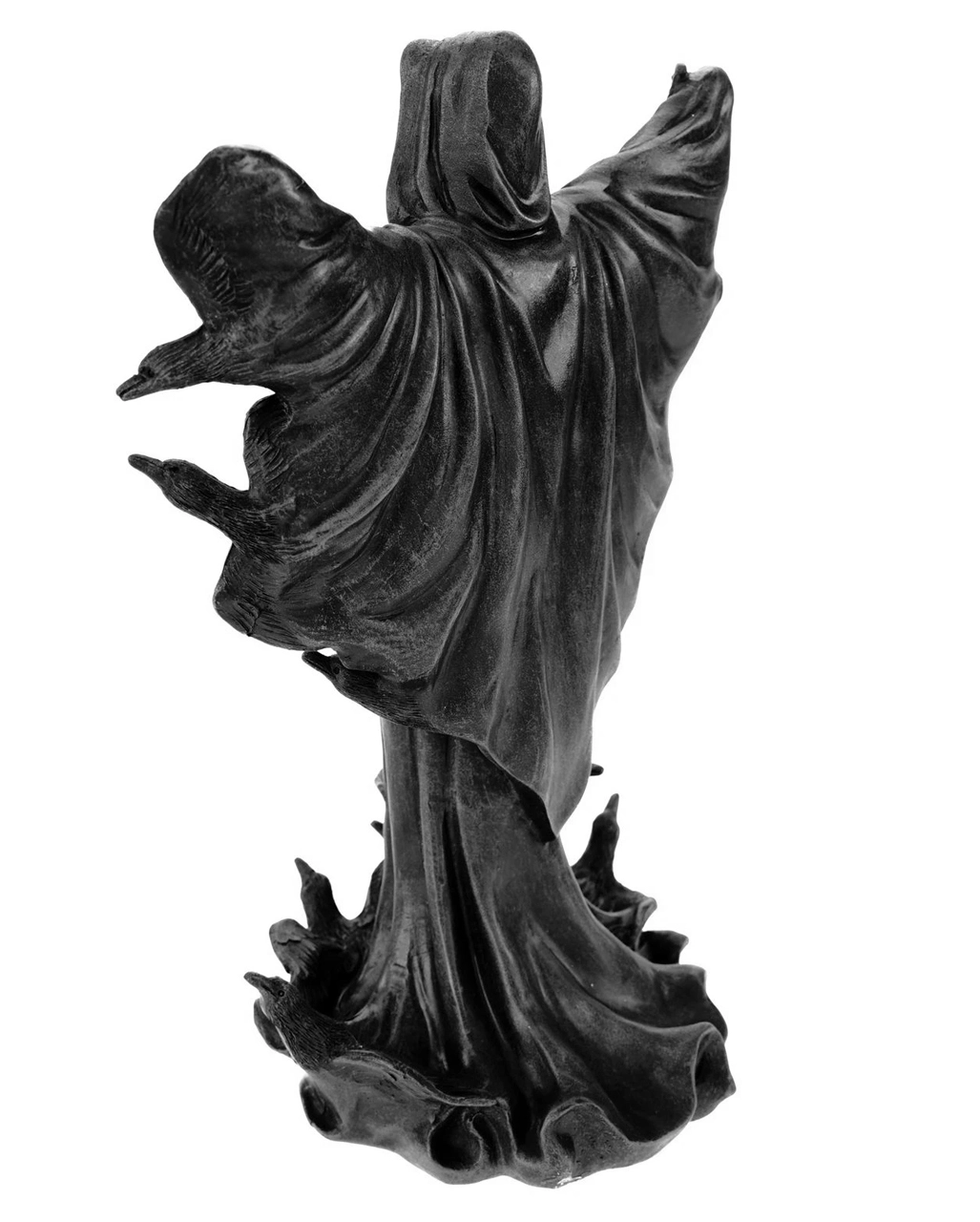 Nimm dich in Acht vor dem Kuttenmann, der dich holen wird, wenn dein letztes Stündlein geschlagen hat. Dieser Grim Reaper mit schwarzen Krähen ist eine düstere Gothic Dekofigur für Fans des Morbiden. Die schwarze Figur kommt in deinem Regal oder auf dem Nachttisch perfekt zur Geltung, wo sie ein mystisches Ambiente verströmt. Die Flügel des Sensenmannes werden aus zahlreichen schwarzen Raben geformt, durch die er noch unheimlicher wirkt.