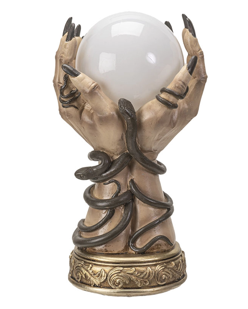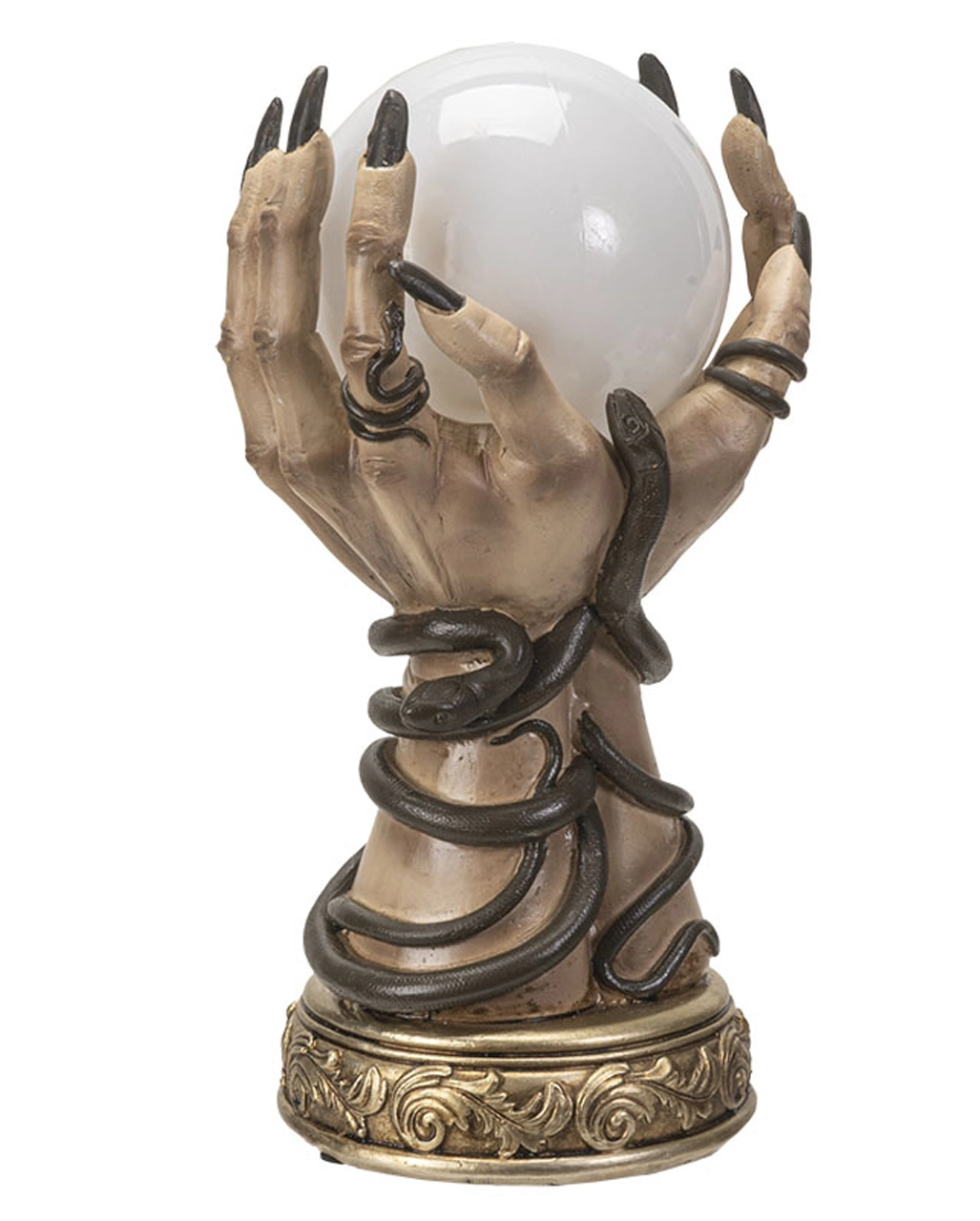 Mit der extravaganten Wahrsagerin Hände mit LED Kugel besitzt du eine sensationelle Tischdekoration und das nicht nur für Halloween und Walpurgisnacht. Zwei spooky aussehende Hexenhände, mit langen schwarzen Fingernägeln, werden von mehreren, grünen Schlangen heimgesucht, während die Hexe verzweifelt versucht, die Wahrsagekugel vor genau diesen zu schützen.