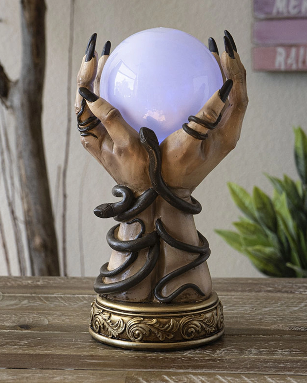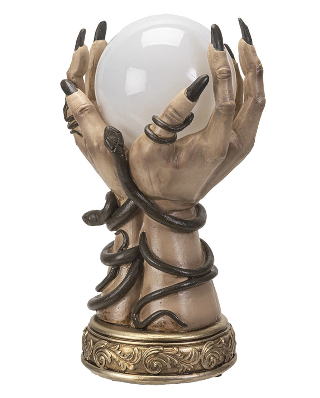Die Wahrsagerin Hände mit LED Kugel sind aus hochwertigem Polyresin gegossen und wurden danach fachmännisch von Hand bemalt. Außergewöhnliche Dekoration für Halloween & Fantasy Fans. In der Mitte sitzt eine Wahrsagekugel mit LED Beleuchtung, die eingeschaltet für einen dramatischen Lichteffekt sorgt. Fantastisch aussehende Tischdeko für Liebhaber von Halloween und Walpurgisnacht.